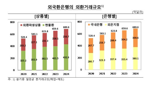 한국은행이 오늘(21일) 발표한 '2024년 중 외국환은행의 외환거래 동향'에 따르면 이 기간 하루 평균 외환거래액(현물환·외환파생상품 거래)은 689억6천만달러로 집계됐습니다.