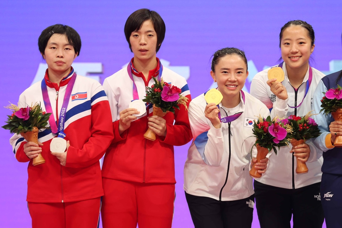 2일 항저우 아시안게임 여자복식에서 금메달을 딴 신유빈-전지희가 은메달을 딴 북한 차수영-박수경과 시상대에서 기념 촬영을 하고 있다. [사진제공=대한탁구협회]여자 복식으로는 1990년 현정화-홍차옥과 2002년 석은미-이은실 조 이후 세 번째 우승입니다.