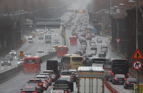 (서울=연합뉴스) 이진욱 기자 = 전국에 눈·비가 쏟아진 27일 오전 경부고속도로 서울 잠원IC 인근 하행선이 정체를 빚고 있다. 한국도로공사는 이날 오후까지 중부 지방을 비롯한 전국 곳곳에 시간당 3∼5㎝의 많은 눈이 예보돼 극심한 정체가 우려된다고 밝혔다.cityboy@yna.co.kr (끝)
