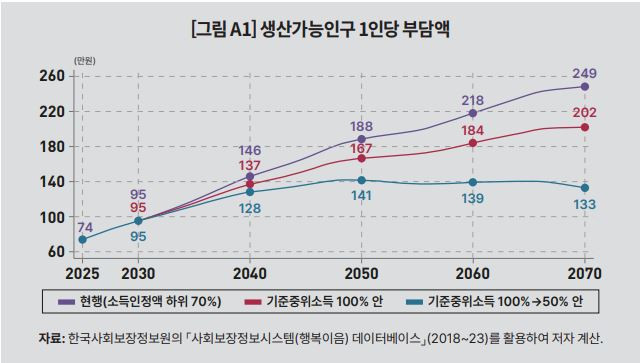 기초연금에 대한 생산가능인구 1인당 부담액도 2070년 기준 현행 249만원보다 약 50% 절감되는 133만 원으로 감소합니다.
