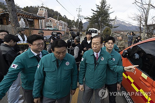 (포천=연합뉴스) 임병식 기자 = 국민의힘 권영세 비상대책위원장(오른쪽에서 두번째)이 6일 경기도 포천시 이동면 노곡리 공군 전투기 폭탄 오발 사고 현장을 둘러보고 있다. 2025.3.6 [공동취재] andphotodo@yna.co.kr