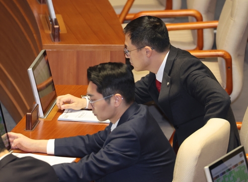 (서울=연합뉴스) 박동주 기자 = 국민의힘 김상욱 의원이 국회 본회의에 참석해 있다. 2025.2.27