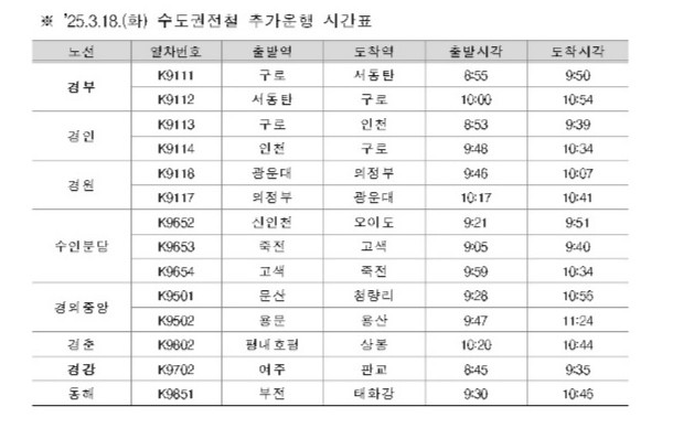 추가 운행 횟수는 수도권 1호선 6회, 수인분당선 3회, 경의중앙선 2회, 경춘선 1회, 경강선 1회, 동해선 1회 등 모두 14회입니다.