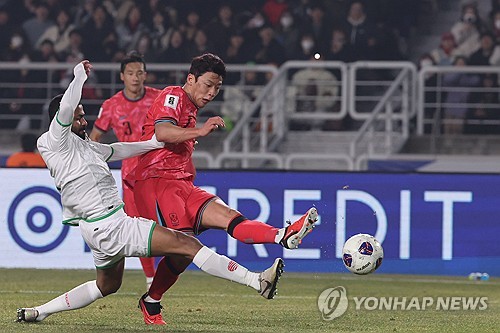 (고양=연합뉴스) 임화영 기자 = 20일 경기도 고양종합운동장에서 열린 2026 북중미 월드컵 아시아 3차 예선 B조 7차전 대한민국과 오만의 경기.황희찬이 득점하고 있다. 2025.3.20 hwayoung7@yna.co.kr