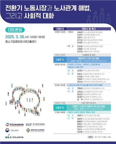 고용노동부와 경제사회노동위원회(경사노위) 등이 오늘(26일) 오후 서울 여의도 중소기업중앙회에서 '전환기 노동시장과 노사관계 해법, 그리고 사회적 대화'를 주제로 대토론회를 엽니다.