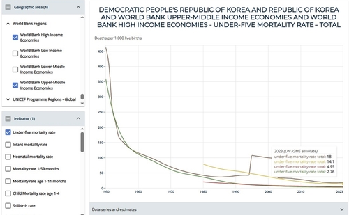 유엔아동사망률측정통합기구가 최근 공개한 영유아 사망률 통계를 보면 2023년 기준 북한의 5세 미만 영유아 사망률은 1,000명당 18명으로 추정됐습니다.