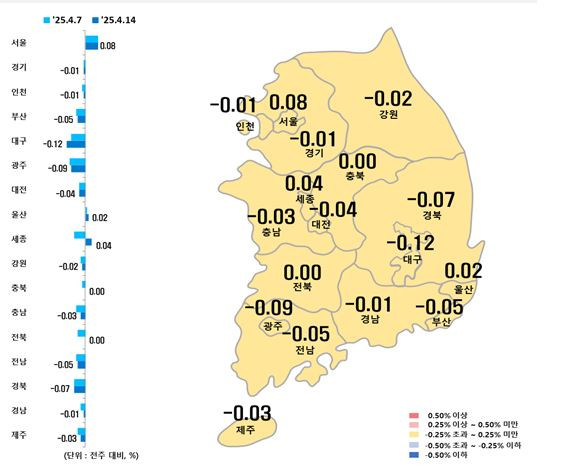 반면 마포구(0.17→0.13%) 강동구(0.11→0.09%) 등은 상승세가 주춤해졌고, 중랑구(0.00→-0.02%)는 하락 전환했습니다.
