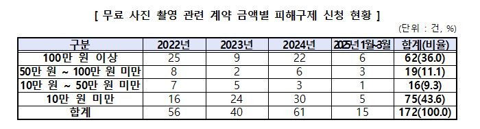 반면 100만 원 이상이 36.0%(62건), 50만 원 이상 100만 원 미만이 11.1%(19건)로 무료 사진 촬영 광고를 통한 방문·촬영임에도 50만 원 이상의 고액 계약을 체결한 사례도 47.1%로 큰 비중을 차지했습니다.