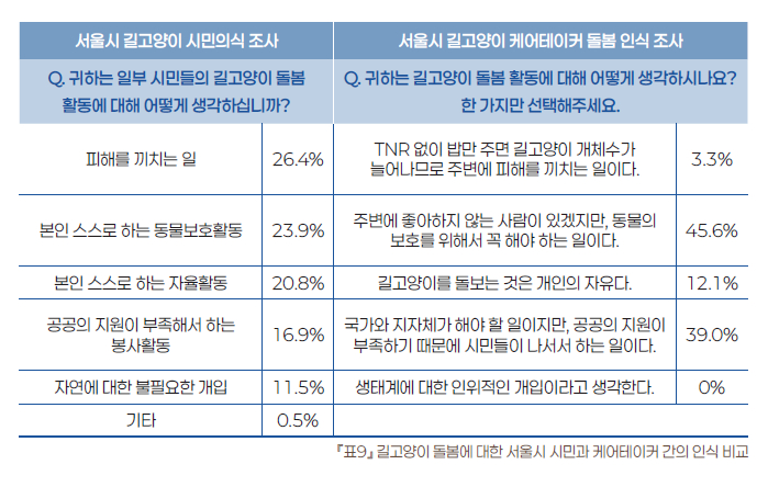 이 단체는 서울시와 함께 지난해 6월부터 10월까지 서울시에서 활동하는 길고양이 ‘케어테이커’ 182명을 대상으로 길고양이 돌봄 인식 설문조사를 실시했습니다.