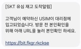 해당 메시지를 보면, "고객님이 예약하신 USIM이 대리점에 입고되었습니다"며 "본인 확인을 위해 URL을 누르라"고 돼있습니다.