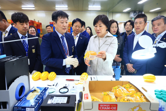 송미령 농림축산식품부 장관은 7일 경북 성주군 소재 월항농협 산지유통센터(APC) 내 수출 선과장을 찾아 참외 수출 검역 현장을 점검했다.[농림축산식품부 제공][농림축산식품부 제공]송미령 농림축산식품부 장관은 오늘(7일) 경북 성주군 소재 월항농협 산지유통센터(APC) 내 수출 선과장을 찾아 참외 수출 검역 현장을 점검했습니다.