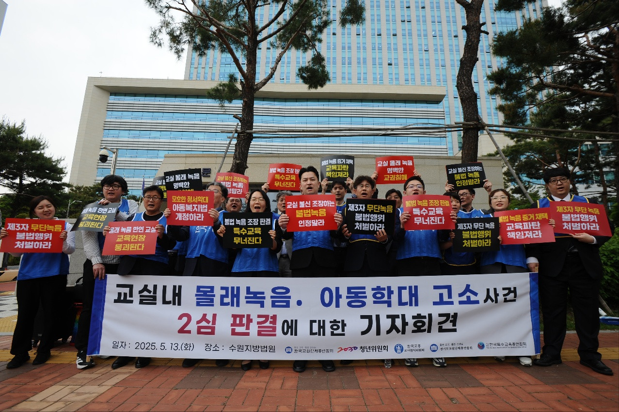 한국교원단체총연합회는 오늘(13일) 항소심 재판이 열린 수원지방법원 앞에서 기자회견을 열고 "항소심 재판부의 판결은 특수교사의 정당한 교육활동을 인정하고 제3자에 의한 몰래 녹음을 불법으로 명시한 통신비밀보호법의 취지를 구현한 마땅한 판결"이라고 했습니다.
