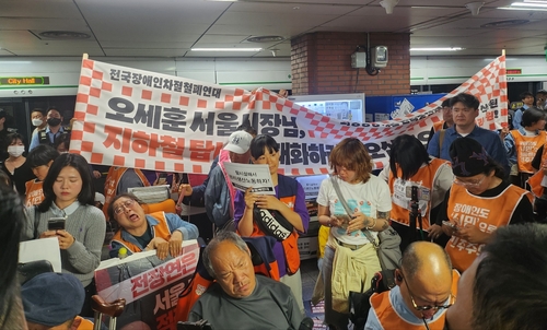 전장연은 오늘(13일) 오후 3시쯤 지하철 2호선 시청역 승강장에서 집회를 열고 오 시장에게 권리중심일자리 최중증장애인 노동자 400명 해고 철회 등을 요구하며 지하철 탑승을 시도하려 했지만, 서울교통공사 측에 가로막혀 무산됐습니다.