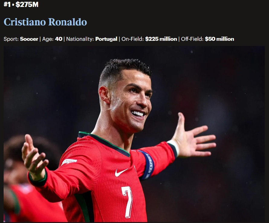 미국 경제지 포브스가 지난 12개월 간 수입을 추산해 발표한 '2025 세계 스포츠선수 수입 순위'에 따르면 호날두는 총 2억7천500만달러를 벌어 1위를 차지했습니다.