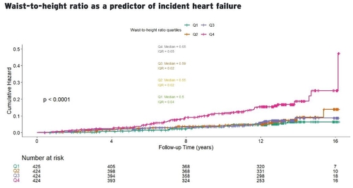 특히 허리둘레-키 비율이 상위 25%인 그룹(WtHR 중앙값 0.65)은 나머지 세 그룹에 비해 심부전 위험이 2.71배 높았습니다.