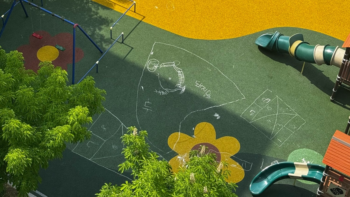 작성자가 함께 올린 사진에는 아파트 베란다 창문을 통해 촬영한 놀이터 바닥이 담겨 있었으며, ‘땅따먹기’게임판과 그림들이 그려져 있는 모습이 확인됐습니다.