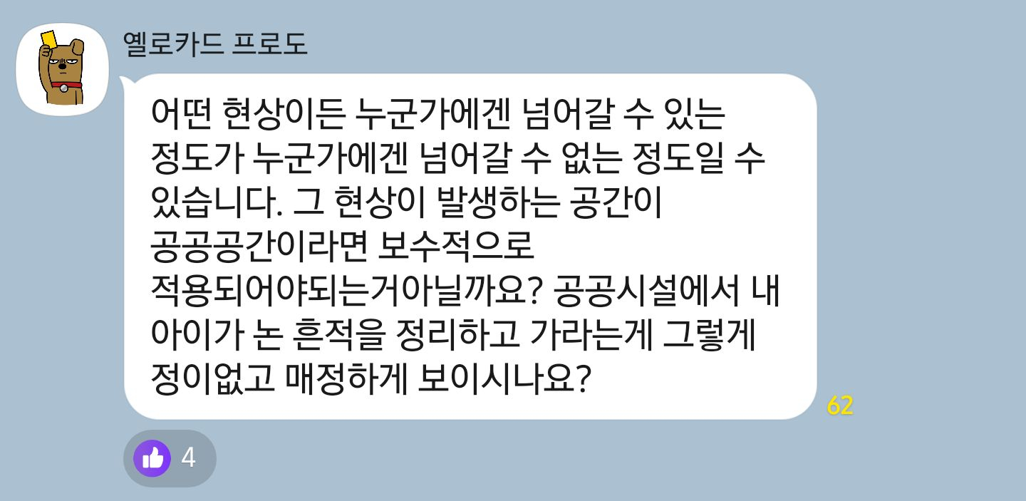 또 “공공시설에서 아이가 놀고 간 흔적을 정리하라고 말하는 게 그렇게 매정한 일인가?”라고도 덧붙였습니다.