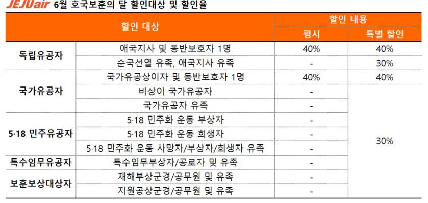 제주항공은 현재 독립유공자(애국지사)와 동반 보호자 1명, 1~4급 국가유공상이자와 동반 보호자 1명에게 40%의 할인을 연중 제공하고 있습니다.