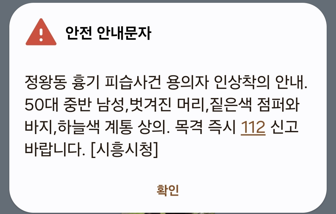 이어 "정왕동 흉기 피습사건 용의자 인상착의 안내. 50대 중반 남성, 벗겨진 머리, 짙은색 점퍼와 바지, 하늘색 계통 상의. 목격 즉시 112 신고를 바랍니다"라는 내용의 안전 안내문자도 추가로 보냈습니다.