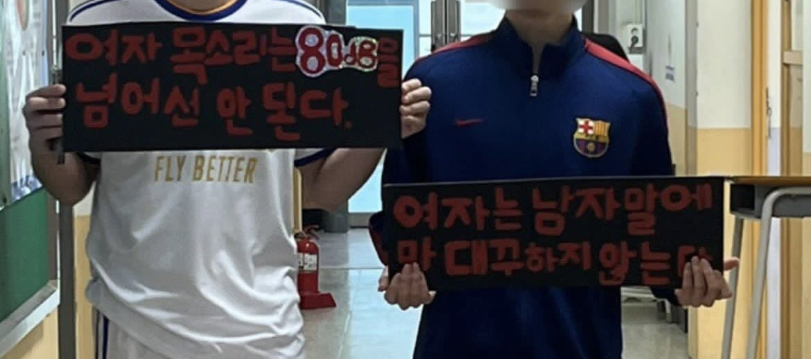 해당 논란은 지난 16일 남학생들이 "여자 목소리는 데시벨 (dB)을 넘어선 안 된다", "여자는 남자 말에 말대꾸하지 않는다"는 팻말을 들고 찍은 사진에서 비롯됐습니다.