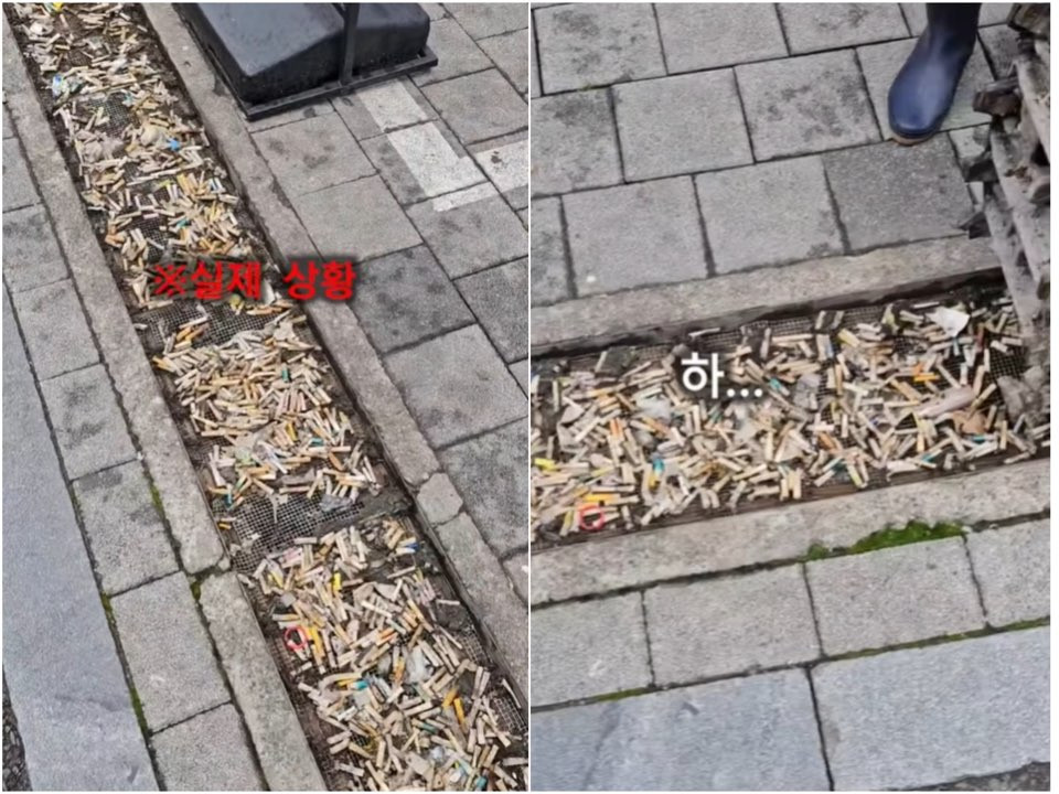 영상에는 배수 기능을 할 수 없을 정도로 배수로에 가득 들어찬 담배 꽁초와 쓰레기의 모습이 담겼습니다.