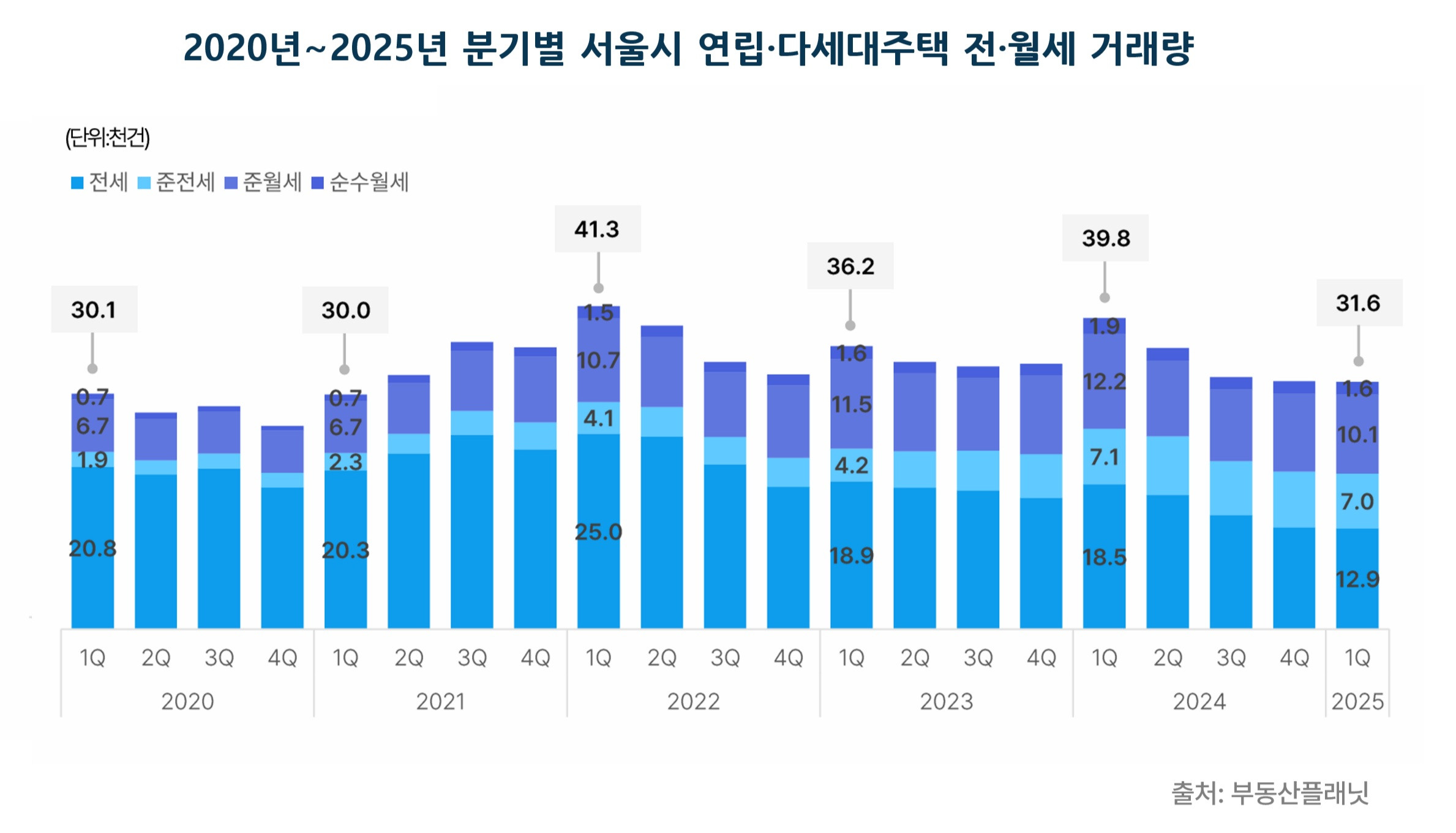 오늘(29일) 상업용 부동산 프롭테크 기업 부동산플래닛에 따르면 지난 1분기 서울의 연립·다세대주택 임대차 거래량은 3만1,645건으로 직전 분기(3만1,740건) 대비 0.3% 줄었습니다.