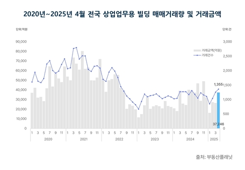 2020∼2025년 4월 상업업무용 빌딩 매매거래량 및 거래금액[부동산플래닛 제공. 재판매 및 DB 금지][부동산플래닛 제공. 재판매 및 DB 금지]지난 4월 전국 상업업무용 빌딩 거래량이 33개월 만에 최고치를 기록하는 등 관련 시장이 회복 조짐을 보이고 있다는 분석이 나왔습니다.