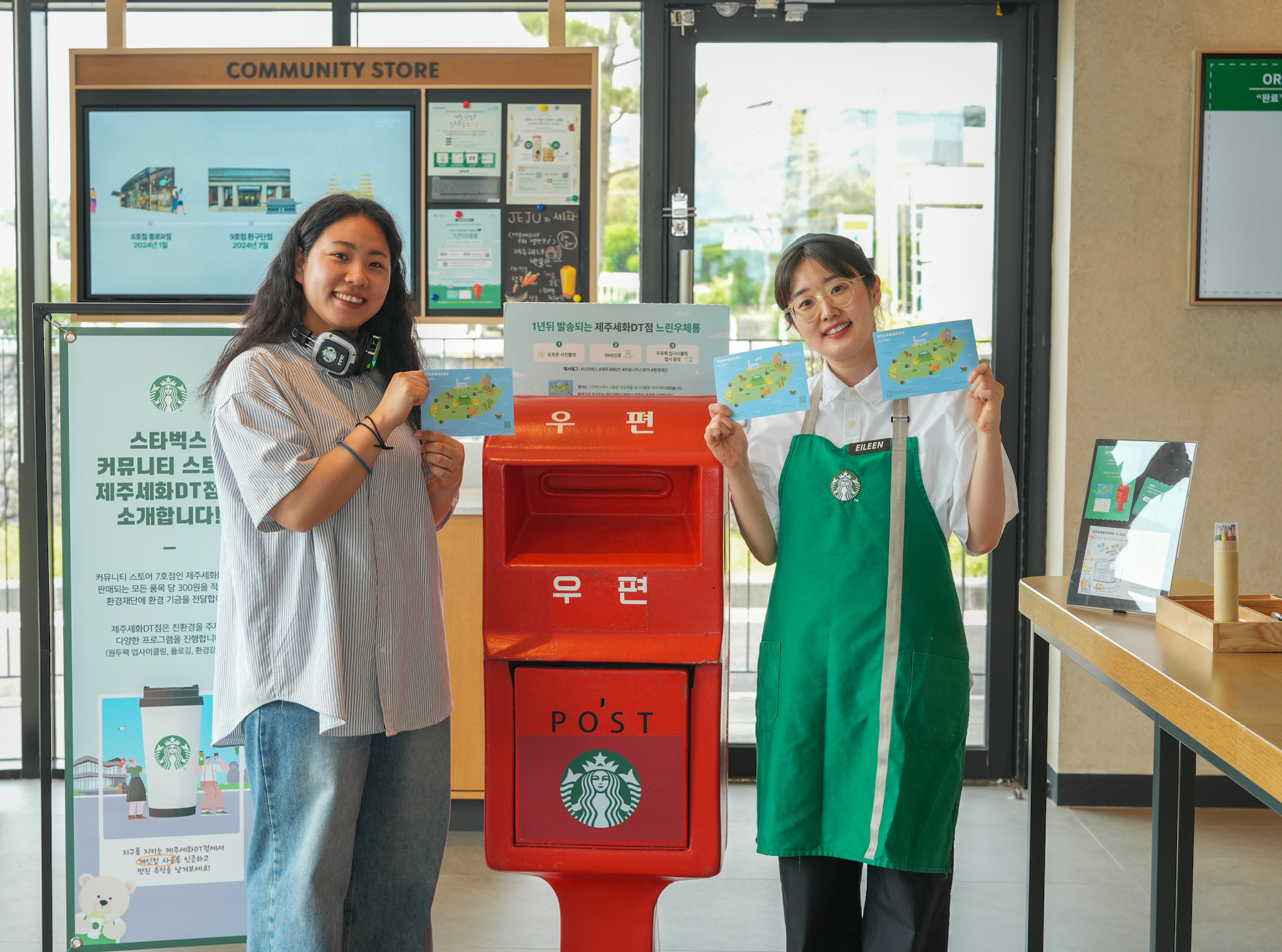 스타벅스는 제주지방우정청으로부터 기증받은 '느린 우체통'을 제주 구좌읍 세화리에 있는 제주세화DT점에 설치해 운영합니다.