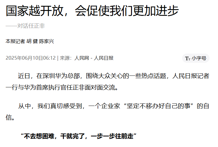 중국 인민일보 런정페이 화웨이 회장 인터뷰 기사배삼진 특파원(baesj@yna.co.kr)
