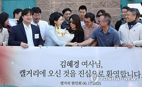 김혜경 여사, 캘거리 한인회 방문(캘거리[캐나다]=연합뉴스) 한상균 기자 = G7 정상회의에 참석하는 이재명 대통령과 함께 캐나다를 방문한 김혜경 여사가 17일(현지시간) 캘거리 한인회관에서 환영나온 주민들과 기념촬영을 하고 있다. 2025.6.18 xyz@yna.co.kr(캘거리[캐나다]=연합뉴스) 한상균 기자 = G7 정상회의에 참석하는 이재명 대통령과 함께 캐나다를 방문한 김혜경 여사가 17일(현지시간) 캘거리 한인회관에서 환영나온 주민들과 기념촬영을 하고 있다. 2025.6.18 xyz@yna.co.krG7 정상회담 참석을 위해 캐나다를 방문한 이재명 대통령의 배우자 김혜경 여사가 현지 교민들을 만나 "조국 걱정으로 더 많이 힘드셨을 것"이라고 위로했습니다.