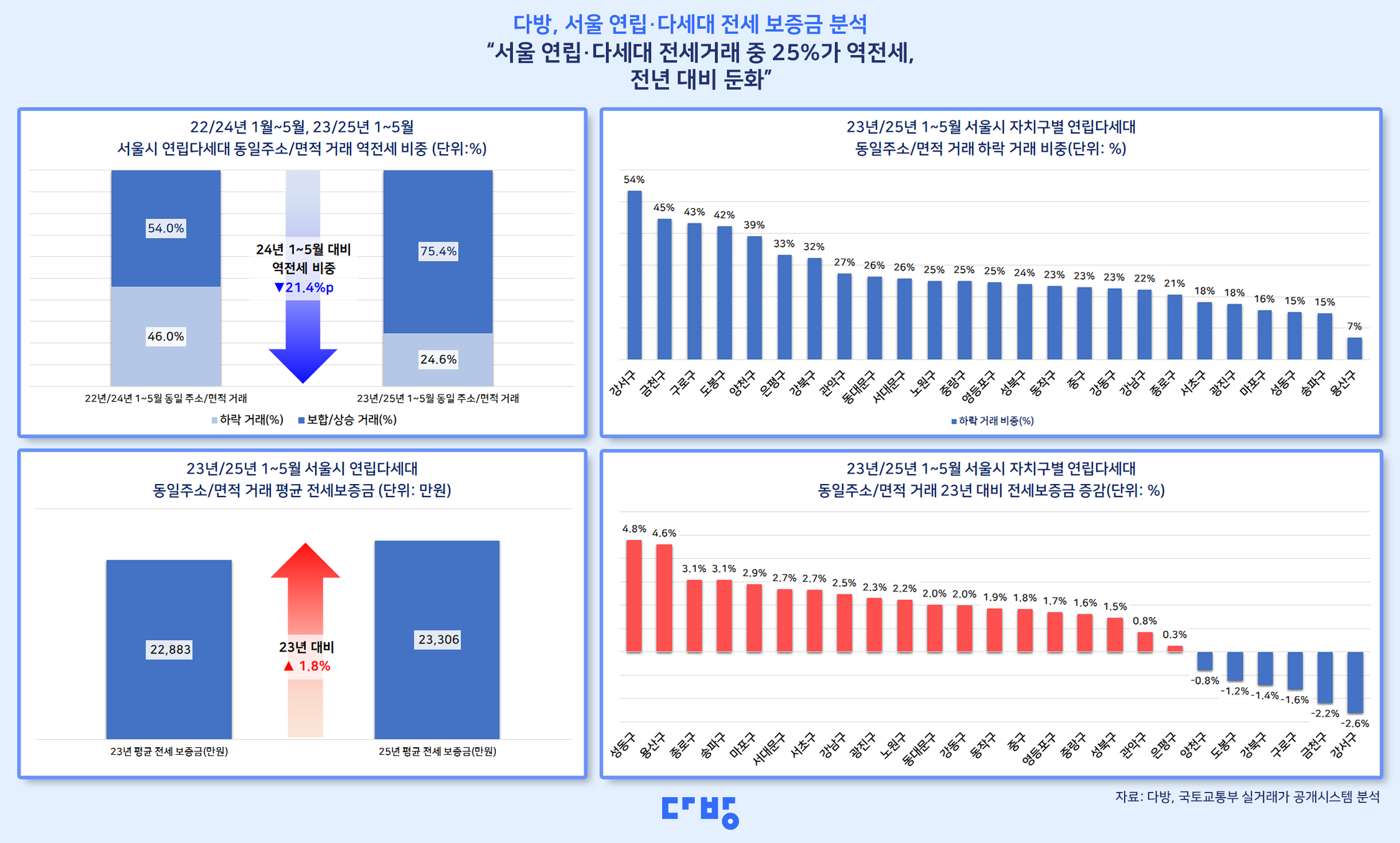 부동산 정보 플랫폼 다방은 서울 연립·다세대의 2023년 1~5월 전세 거래 3만1,166건 중 올해 1~5월 동일 주소지와 면적에서 1건 이상의 거래가 발생한 7,547건을 분석한 결과, 24.6%(1,857건)가 역전세라고 오늘(19일) 밝혔습니다.