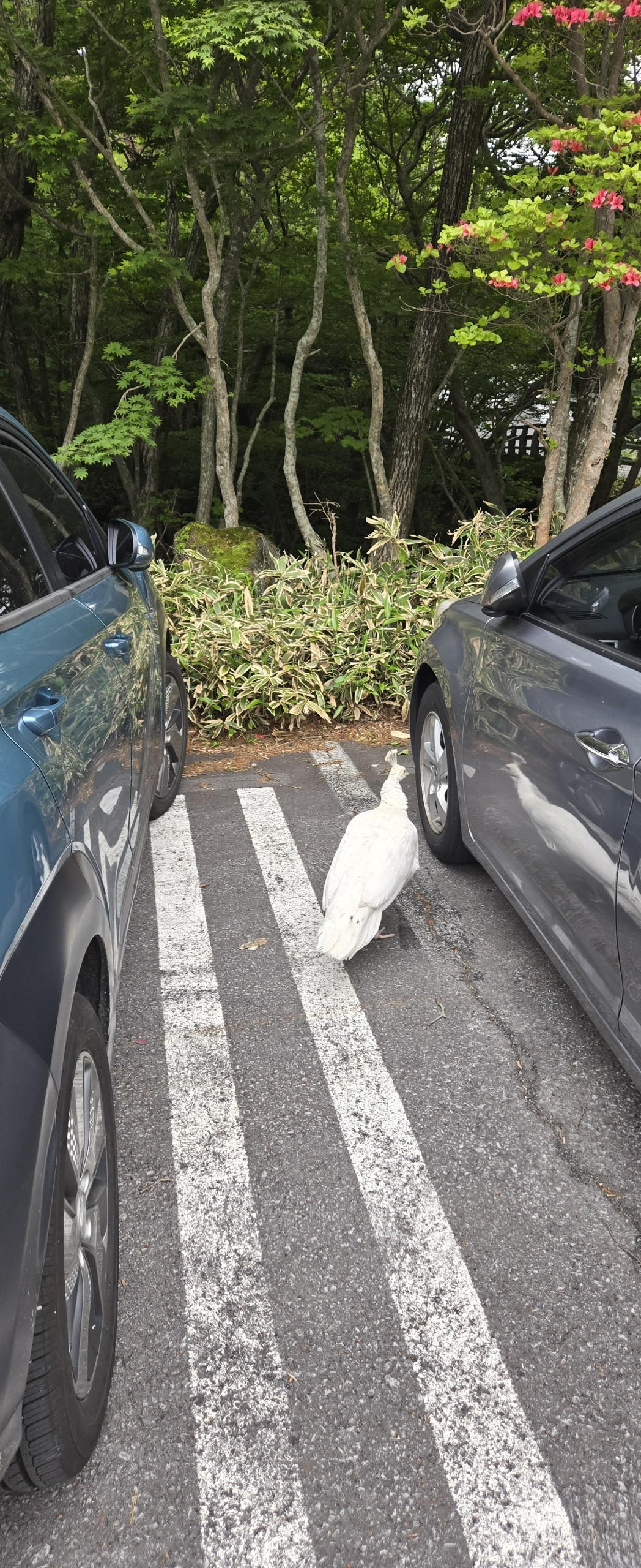 아직 어린 새끼로 추정된 흰 공작새는 주차장을 자유롭게 돌아다녀 탐방객들의 시선을 사로잡았습니다.
