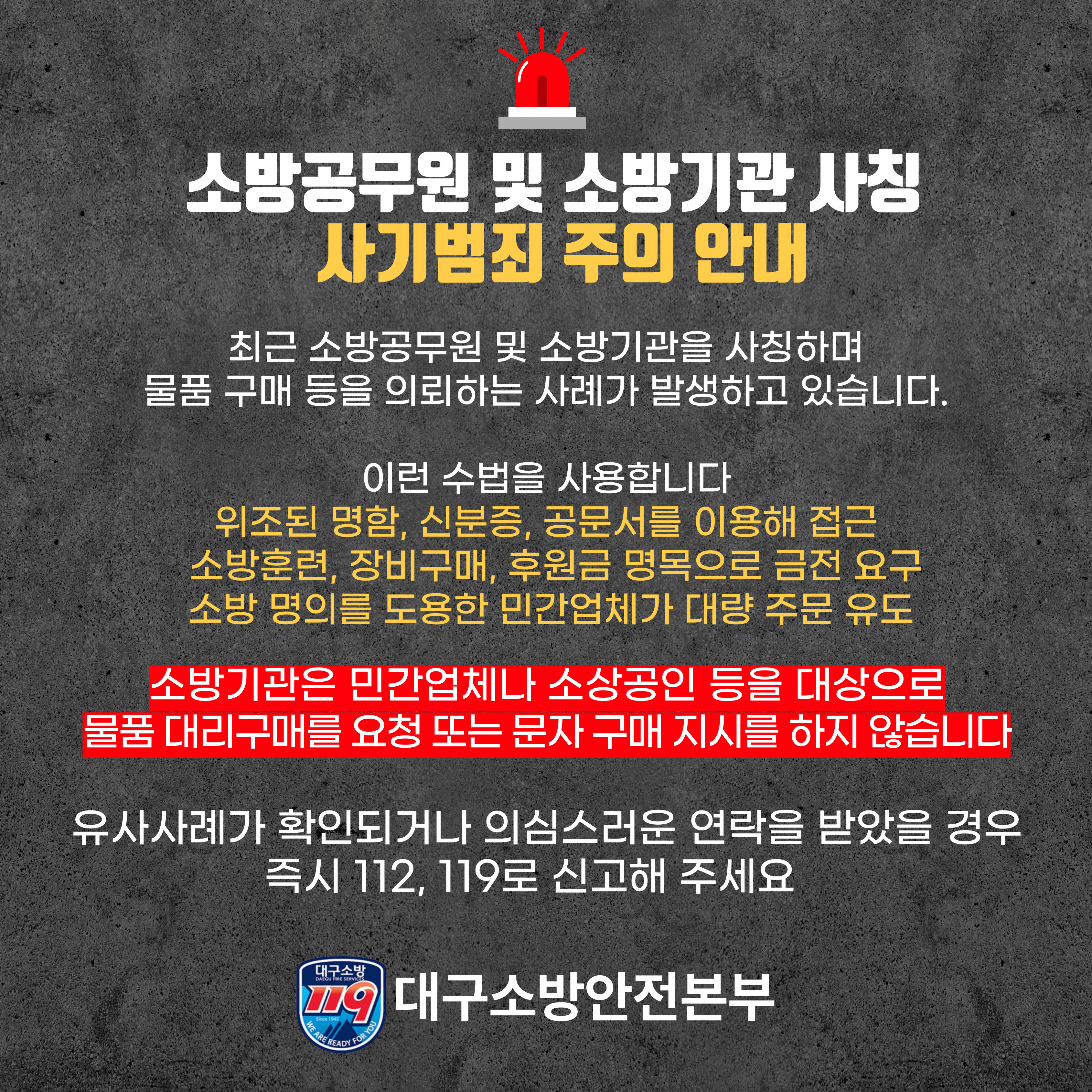 대구소방본부는 "소방관이나 소방기관은 어떤 경우에도 민간에 금품이나 판매를 요구하지 않는다"며 "소방관을 사칭해 금전을 요구하는 경우 즉시 관할 소방서나 경찰서에 신고해달라"고 당부했습니다.