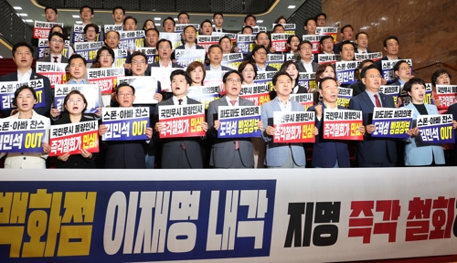 구호 외치는 국민의힘 의원들[연합뉴스 제공][연합뉴스 제공]국민의힘은 김민석 국무총리 후보자 인사청문회와 관련해 "민주당의 일방통행식 주장과 강요로, 오늘 결국 증인 채택에 이르지 못했다"며 유감의 뜻을 밝혔습니다.