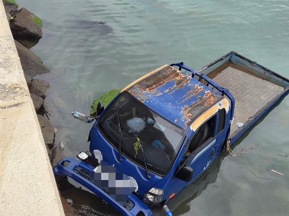 선착장 앞 바다에 추락한 트럭[완도해양경찰서 제공][완도해양경찰서 제공]오늘(25일) 오전 6시 11분쯤 전남 완도군 금당면 한 선착장 앞바다에 1.5t 트럭이 빠져 있다는 신고가 해경에 접수됐습니다.