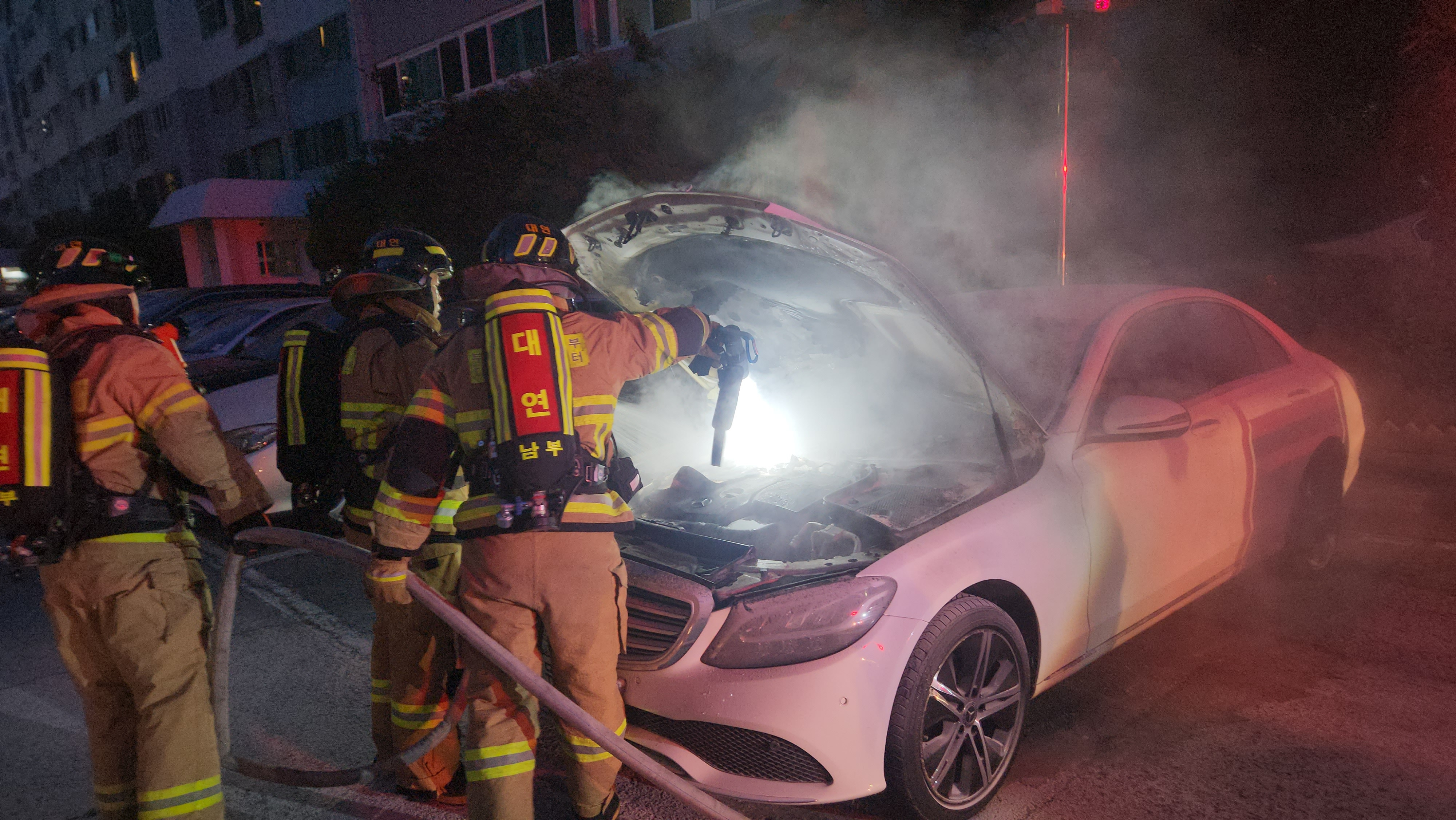 불이 난 벤츠 승용차부산소방재난본부 제공부산소방재난본부 제공어제(1일) 저녁 8시쯤, 부산시 수영구 남천동 한 아파트 주차장에 주차된 벤츠 승용차에서 불이 났습니다.