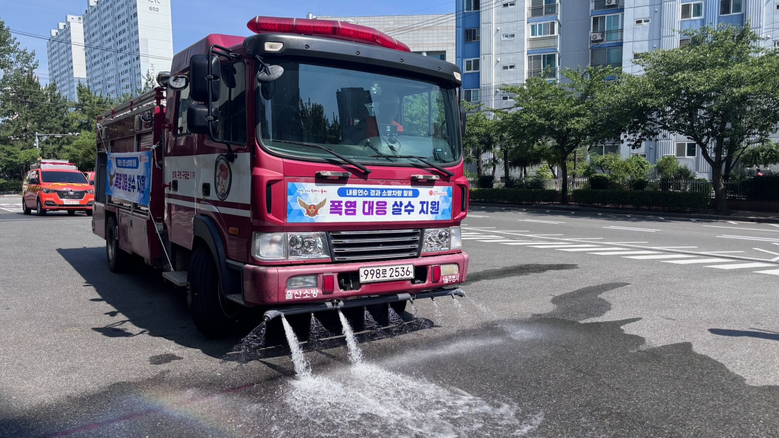 노면 온도를 낮추기 위한 도로 살수 작업은 예년보다 10일 빨리 시작했고 지난 3일부터는 사용 연한이 지난 소방차 6대를 개조해 살수차로 시범 운영에 들어갔습니다.