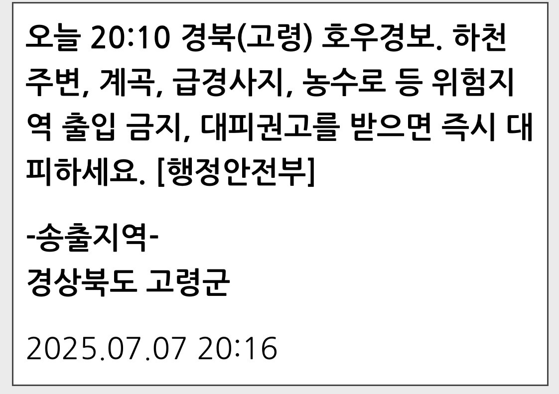 행정안전부는 호우경보가 발령된 고령군에 하천 주변, 계곡, 급경사지, 농수로 등 위험 지역에 출입하지 말고, 대피 권고를 받으면 즉시 대피해 달라는 재난 문자를 발송했습니다.