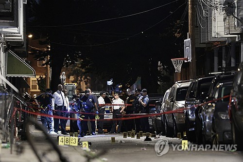 사건 현장[The Philadelphia Inquirer / AP=연합뉴스][The Philadelphia Inquirer / AP=연합뉴스]필라델피아 경찰에 따르면, 현장에서 수십 개의 탄피가 발견됐으며 당시 약 40명의 사람들이 있던 것으로 알려졌습니다.