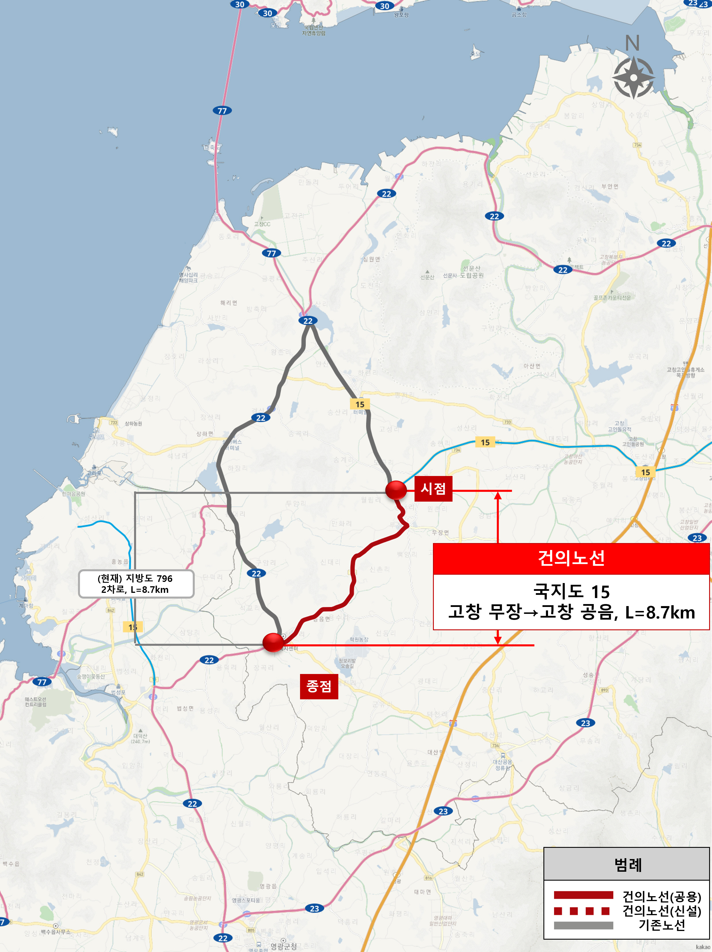 고창 지방도 796호선 노선[고창군 제공·재판매 및 DB금지][고창군 제공·재판매 및 DB금지]전북 고창군은 오늘(11일) 고창 무장면에서 공음면을 오가는 지방도 796호선 8.7㎞ 구간이 국가지원지방도(국지도) 15호선으로 승격됐다고 밝혔습니다.