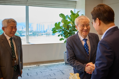 (서울=연합뉴스) 이재명 대통령이 11일 서울 용산 대통령실 청사에서 조갑제 '조갑제닷컴' 대표와 오찬에 앞서 인사하고 있다. 2025.7.11 [대통령실 제공. 재판매 및 DB 금지]