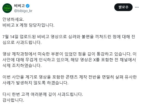 비비고는 오늘(17일) 오전 공식 SNS를 통해 "14일 업로드된 비비고 영상으로 심려와 불편을 끼쳐드린 점 진심으로 사과드린다"라고 밝혔습니다.