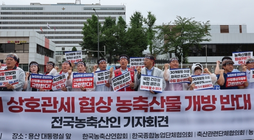 한국농축산연합회와 한국종합농업단체협의회, 축산관련단체협의회, 농민의길 등 농축산업 단체들은 오늘(18일) 용산 대통령실 앞에서 공동 기자회견을 열어 "농업인의 양해와 동의 없이 농축산물 관세, 비관세 장벽을 허문다면 절대 간과하지 않을 것"이라며 "대한민국 농업의 지속성 확보와 5천만 국민의 건강권 보장을 위해 투쟁에 나서겠다"고 밝혔습니다.