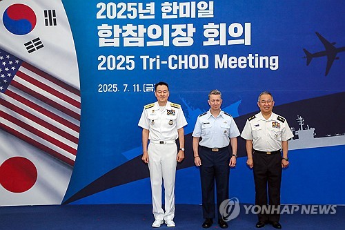 기념 촬영하는 한미일 합참의장(서울=연합뉴스) 김명수 합참의장이 11일 서울 용산구 합동참모본부 청사에서 열린 한미일 합참의장 회의에서 댄 케인 미국 합참의장과 요시다 요시히데 일본 통합막료장과 기념 촬영하고 있다. 2025.7.11 [합참 제공. 재판매 및 DB 금지] photo@yna.co.kr(서울=연합뉴스) 김명수 합참의장이 11일 서울 용산구 합동참모본부 청사에서 열린 한미일 합참의장 회의에서 댄 케인 미국 합참의장과 요시다 요시히데 일본 통합막료장과 기념 촬영하고 있다. 2025.7.11 [합참 제공. 재판매 및 DB 금지] photo@yna.co.kr북한이 한미일 안보협력에 대해 "새로운 핵전쟁을 불러오고 있다"며 거칠게 비난했습니다.
