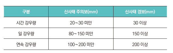 산사태는 한 시간 강수량 30㎜, 일 강수량 150㎜, 연속 강수량 200㎜이상일 때 발생할 가능성이 큽니다.