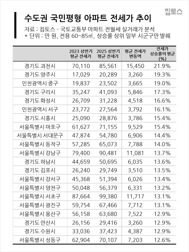 경기도 과천시 국민평형 전셋값은 2년 만에 21.9%(1억5,450만원) 올라 수도권 최고 상승률을 기록했습니다.