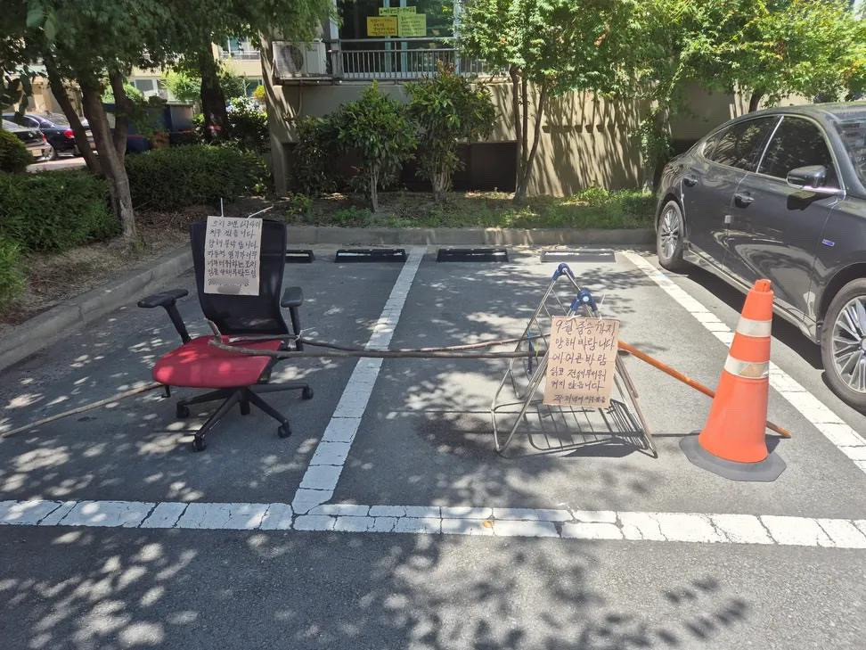 글과 함께 올라온 사진에는 아파트 단지 지상 주차 공간을 고깔과 빨래 건조대, 의자를 이용해 막아둔 모습이 담겨 있었습니다.