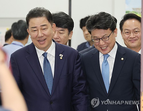 밝은 표정의 김병기-진성준(서울=연합뉴스) 박동주 기자 = 더불어민주당 김병기 당대표 직무대행 겸 원내대표, 진성준 정책위의장이 31일 서울 여의도 국회에서 열린 정책조정회의에 참석하고 있다. 2025.7.31 pdj6635@yna.co.kr(서울=연합뉴스) 박동주 기자 = 더불어민주당 김병기 당대표 직무대행 겸 원내대표, 진성준 정책위의장이 31일 서울 여의도 국회에서 열린 정책조정회의에 참석하고 있다. 2025.7.31 pdj6635@yna.co.kr