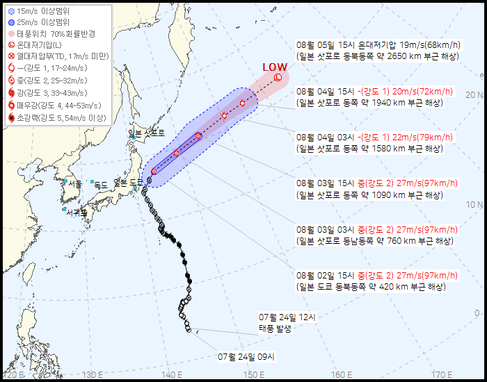 열대 폭풍들이 북동쪽으로 이동하며 우리나라를 덮고 폭염을 일으킨 고온다습한 공기덩이도 세력이 약화하고 북동진해 빠져나가고 있습니다.