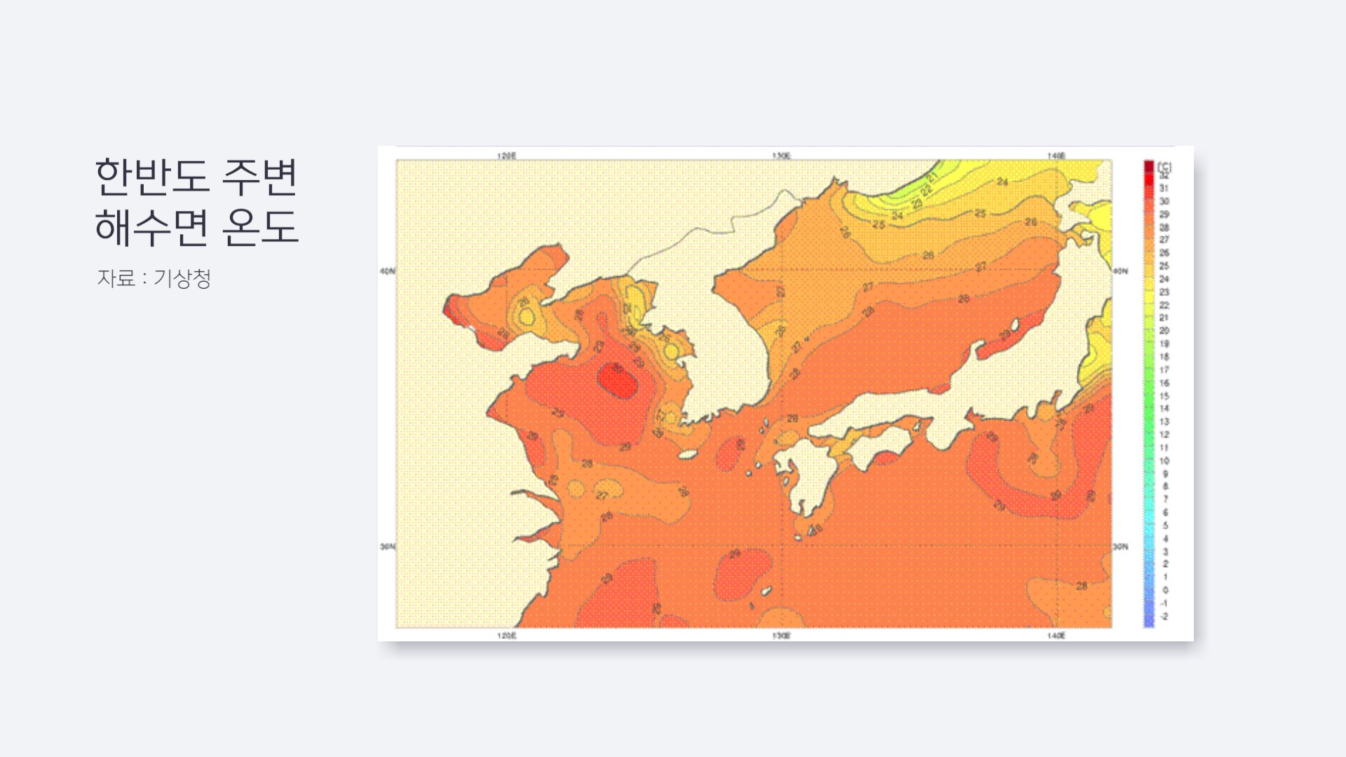 최근 한반도 주변 해수면 온도[연합뉴스TV 제작][연합뉴스TV 제작]뜨거운 바다도 극한 폭우를 만드는 데 한몫했습니다. 올해 펄펄 끓는 극한 폭염에 한반도 바다 온도는 평년보다 2~3도나 상승했습니다.